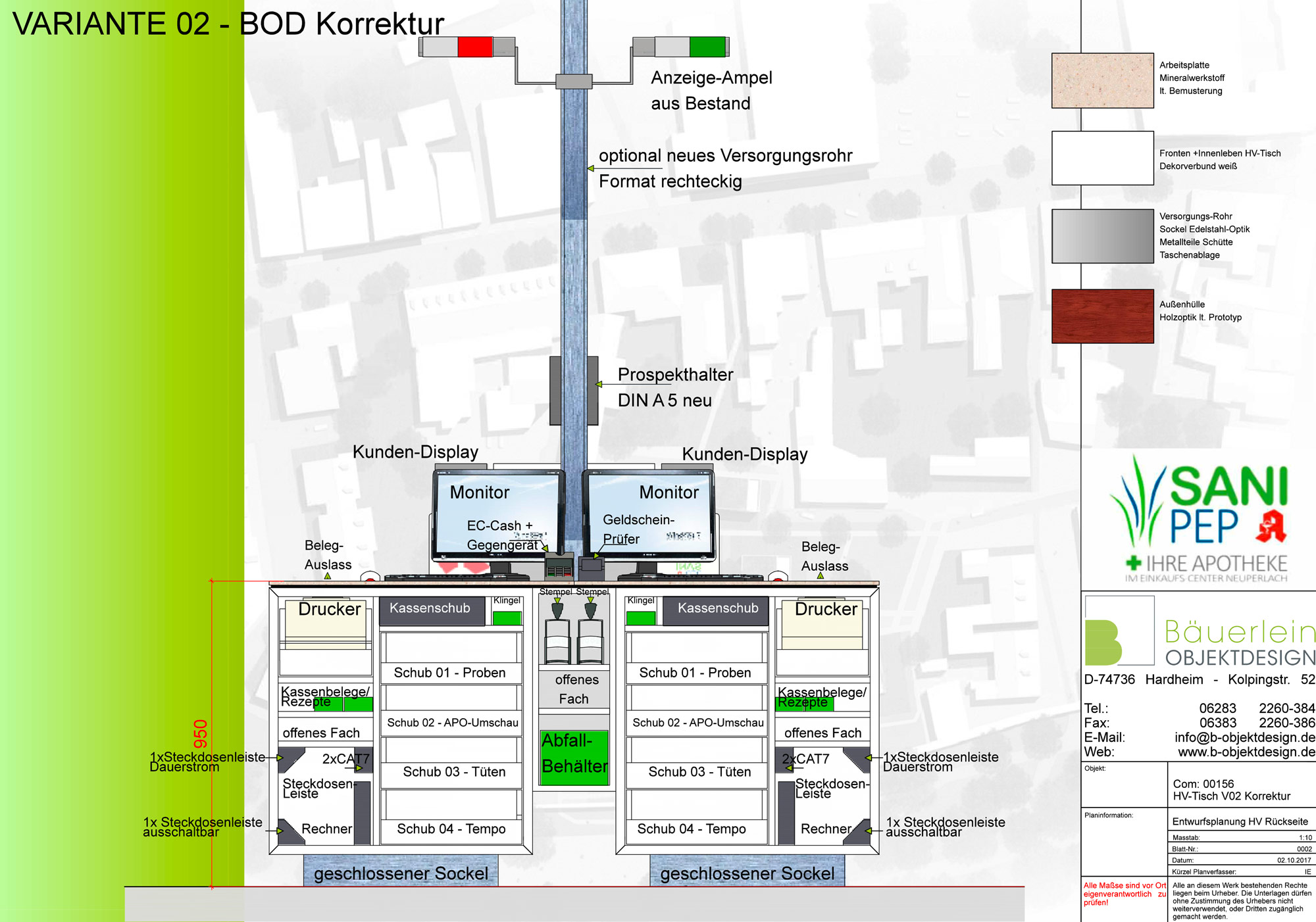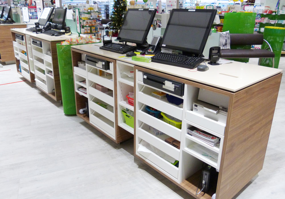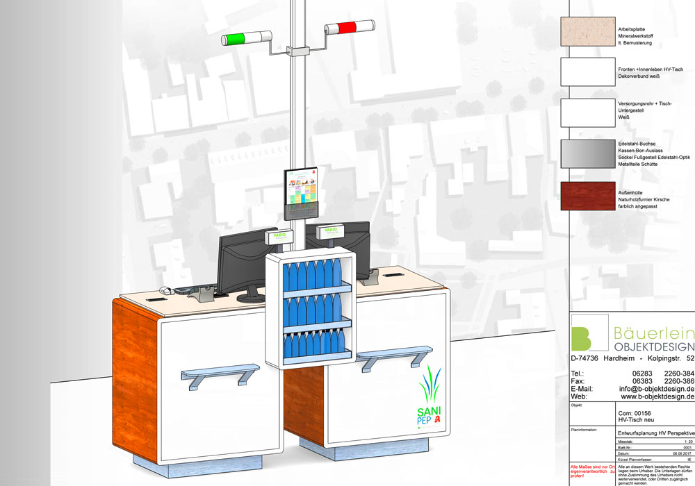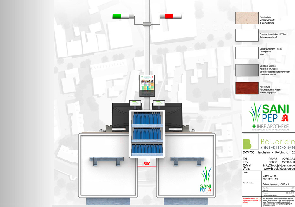 Im Fokus stand ein präzise umgesetztes Upcycling-Konzept: Die bestehenden HV-Tische wurden nicht ersetzt, sondern durch gezielte Maßnahmen technisch optimiert und gestalterisch neu interpretiert. Bäuerlein Objektdesign im Apothekenbau passte Oberflächen, Details und Funktionen so an, dass die Möbel heutigen Anforderungen im Apothekenalltag entsprechen. Dabei wurden Aspekte wie Ergonomie, Arbeitsabläufe und Integration moderner Kassensysteme konsequent berücksichtigt.