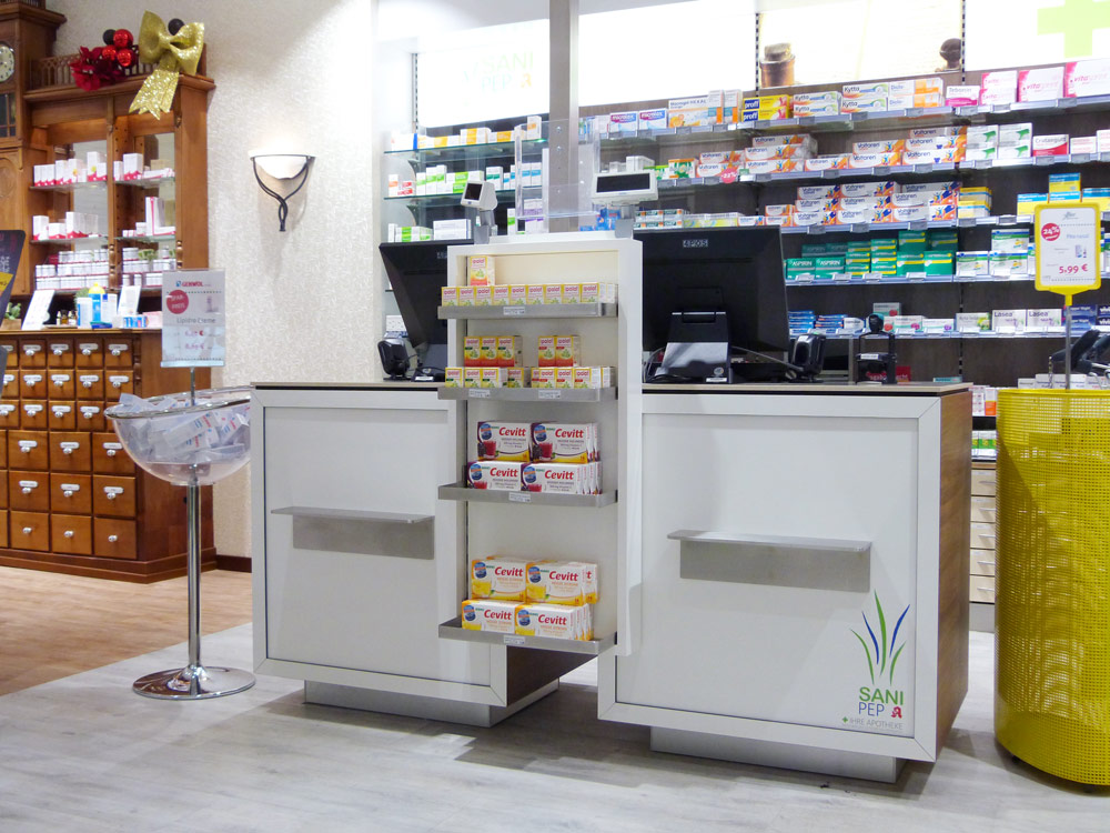 Gleichzeitig erfolgte durch Bäuerlein Objektdesign im Apothekenbau eine klare Abstimmung auf das bestehende Erscheinungsbild der Apotheke. Die modernisierten HV-Tische fügen sich harmonisch in das Gesamtbild ein und tragen zu einer ruhigen, strukturierten Raumwirkung bei. Durch die Kombination aus Bestand und zeitgemäßer Gestaltung entstand eine Lösung, die sowohl funktional überzeugt als auch ästhetisch aufwertet.