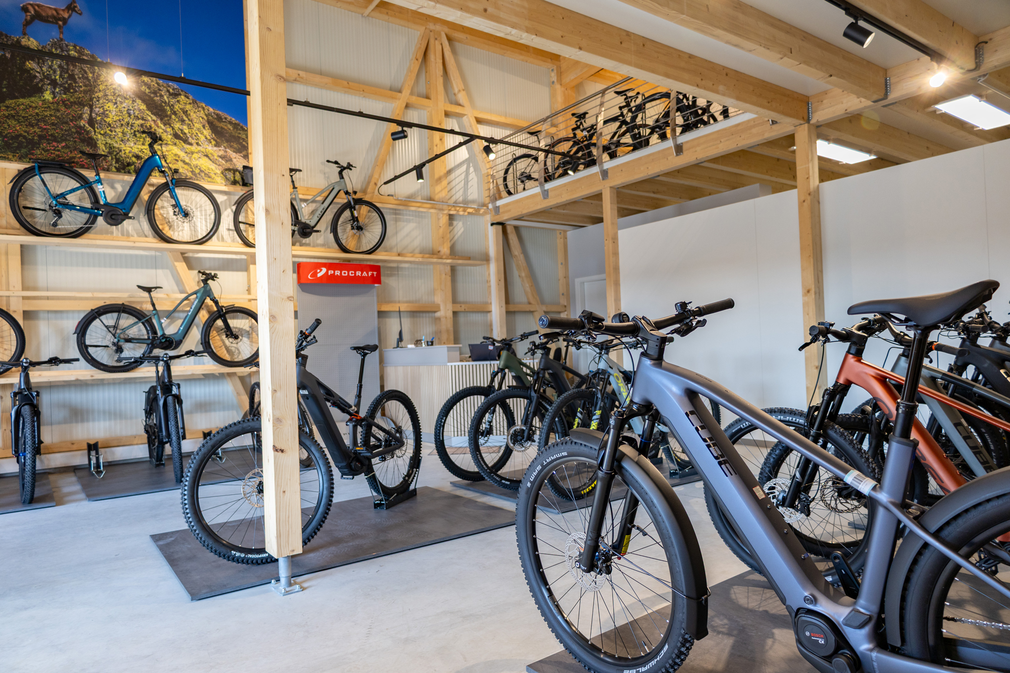 Ein zentrales Element des Ladenbaus ist die offene Galerie bzw. Empore, die zusätzliche Ausstellungsfläche schafft und gleichzeitig eine beeindruckende Raumwirkung erzeugt. Durch die vertikale Nutzung des Raumes entsteht mehr Platz für die Präsentation verschiedener Fahrradmodelle, ohne die Übersichtlichkeit im Verkaufsraum zu beeinträchtigen.