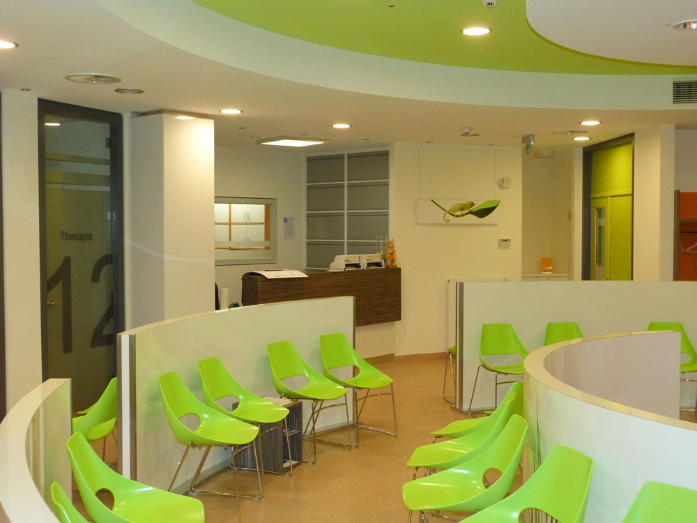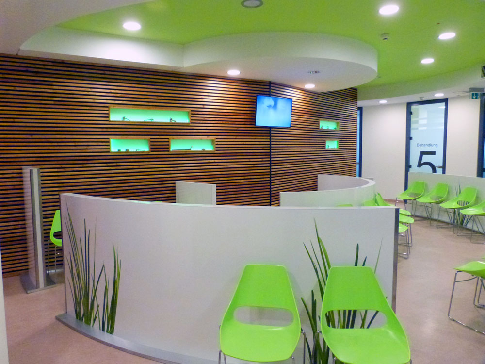Der Wartebereich erhielt ein neues Design auf den bestehenden Wandtrennungen, die Deckengestaltung mit Lichtakzenten sorgt für eine angenehme Atmosphäre.