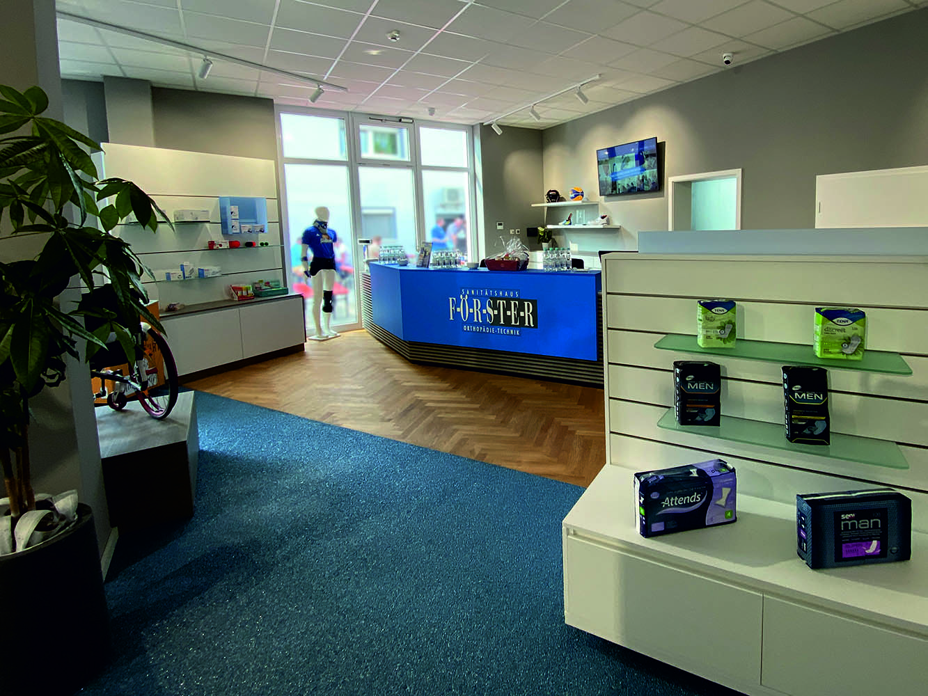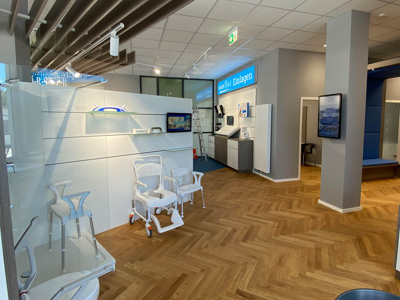Auch die Kassenzone wurde gestalterisch in das Gesamtkonzept integriert. Die blau gestaltete Kassentheke bildet einen klaren Anlaufpunkt und unterstreicht das moderne Erscheinungsbild des Sanitätshauses. Ergänzt wird dies durch flexibel einsetzbare Raumtrenner, die eine strukturierte Zonierung ermöglichen, ohne die Offenheit des Raumes zu beeinträchtigen.