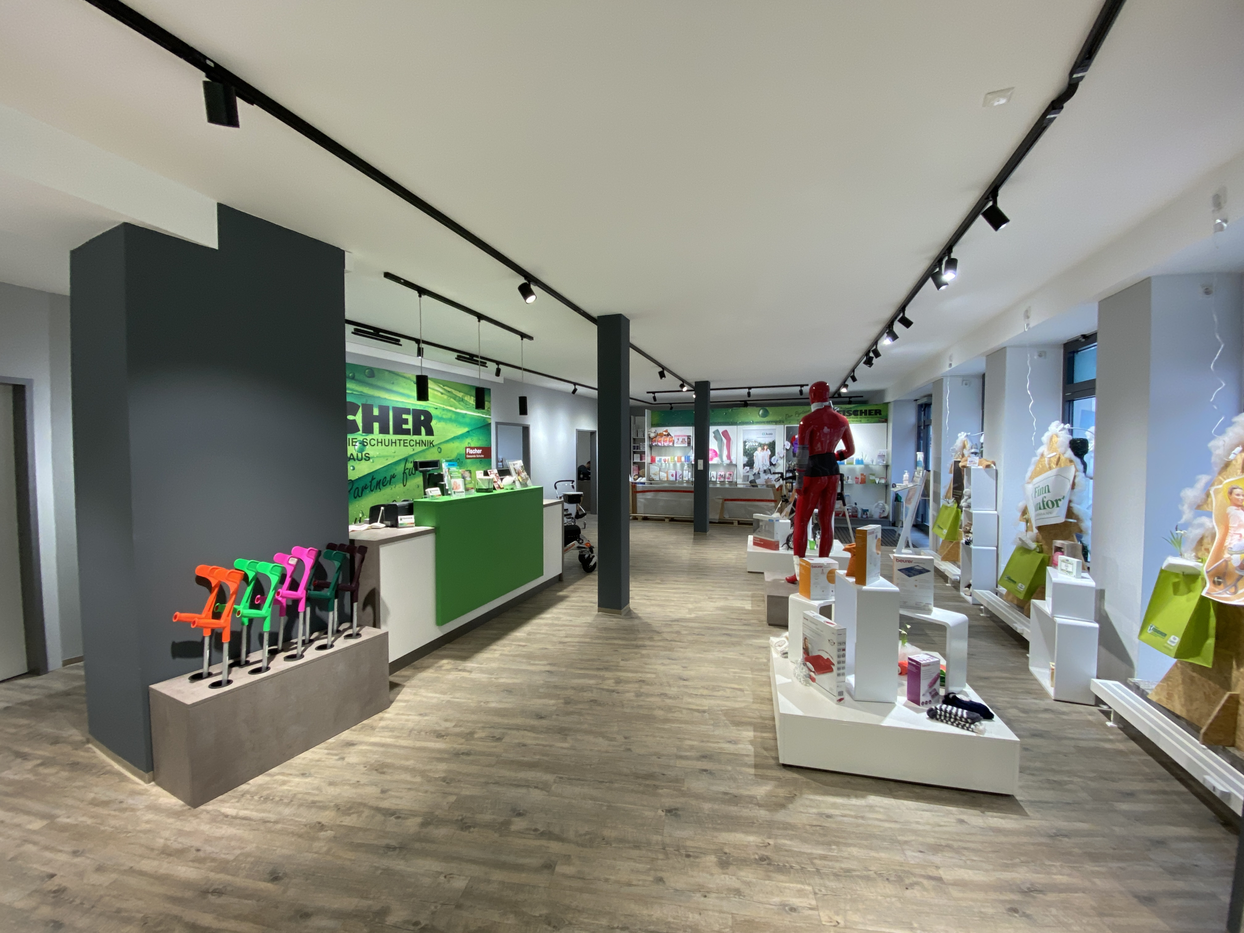 Im Rahmen des Umbaus eines rund 170 m² großen Sanitätshauses übernahm Bäuerlein Objektdesign die vollständige technische und gestalterische Umsetzung. Der Fokus lag darauf, ein modernes Sanitätshaus zu realisieren, das sowohl funktionale Anforderungen im Orthopädiebau erfüllt als auch eine angenehme, vertrauensvolle Atmosphäre für Kund:innen schafft.