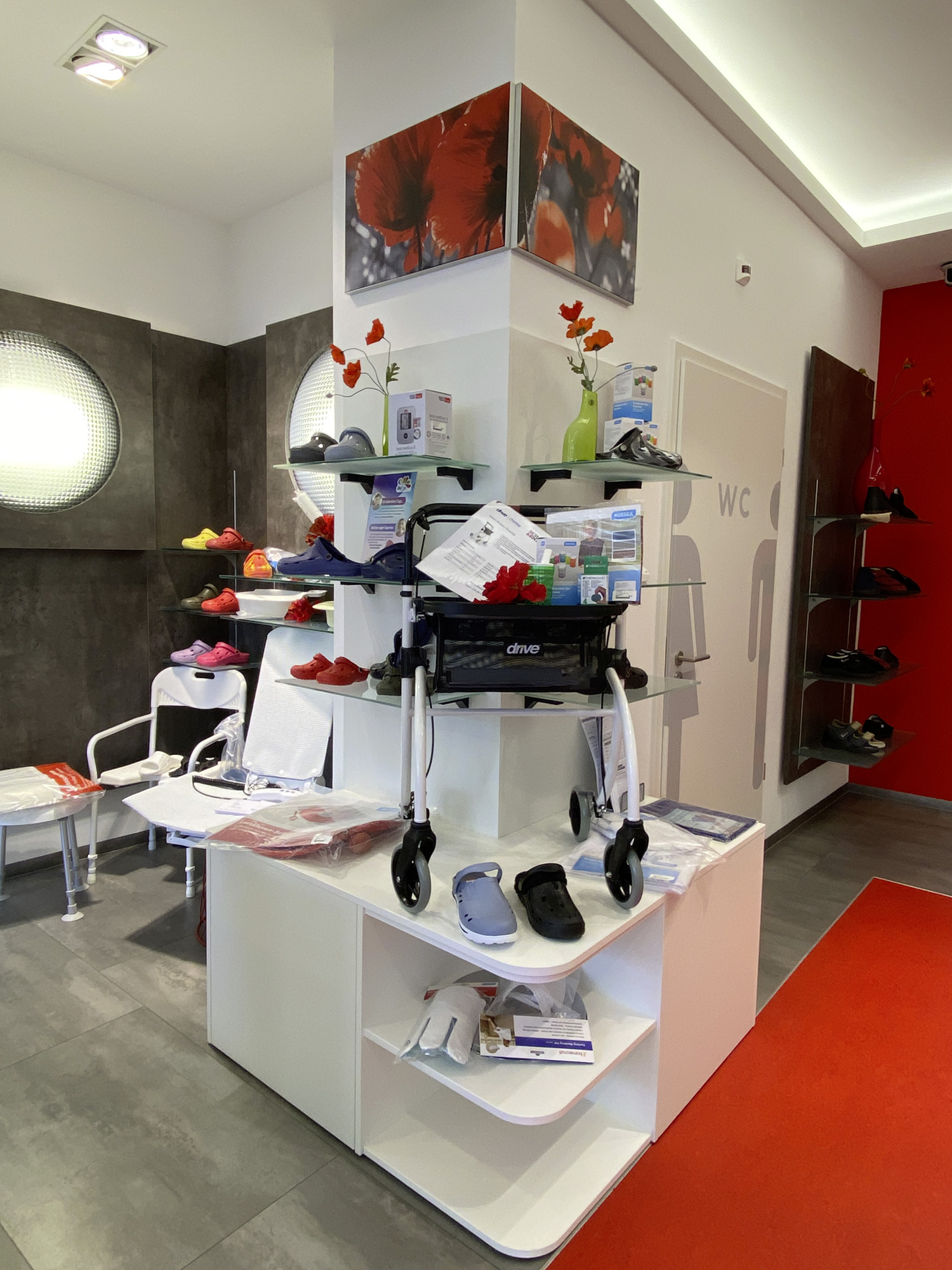 Im Sinne eines gestalterischen Facelifts entstand durch konsequentes Upcycling ein neues Nutzungskonzept, das die Anforderungen eines zeitgemäßen Sanitätshauses optimal erfüllt. Dabei wurde besonderer Wert auf die intelligente Integration vorhandener Elemente gelegt. Bestehende Möbel und Einbauten wurden nicht nur wiederverwendet, sondern funktional neu interpretiert und an die Anforderungen im Orthopädiebereich angepasst. Materialien wie Holz, Metall und Glas wurden sorgfältig aufgearbeitet und in neue Oberflächen sowie Präsentationslösungen überführt.