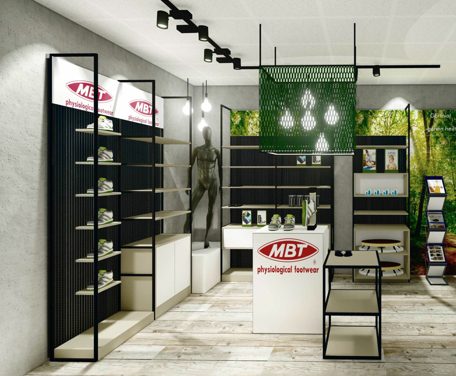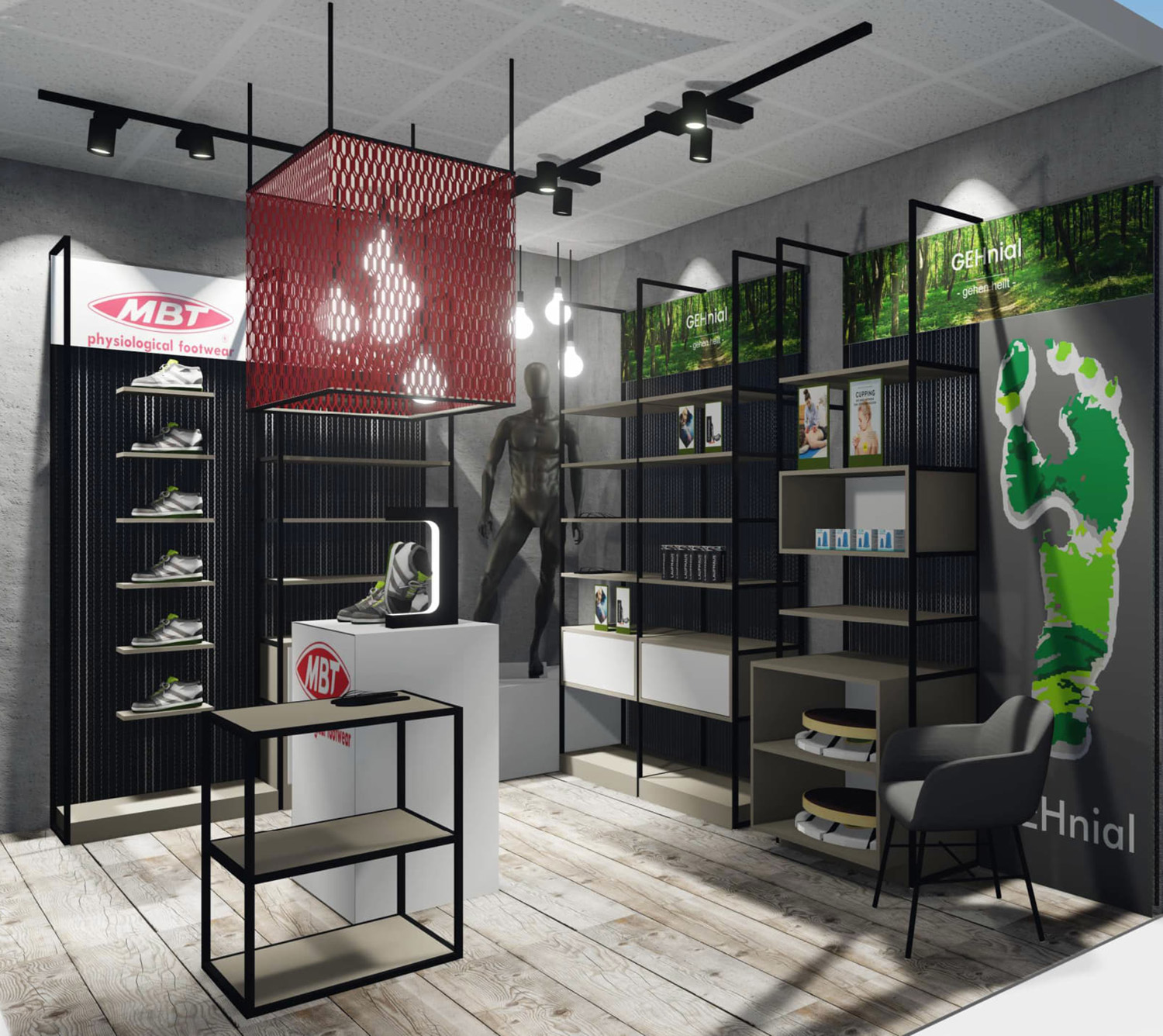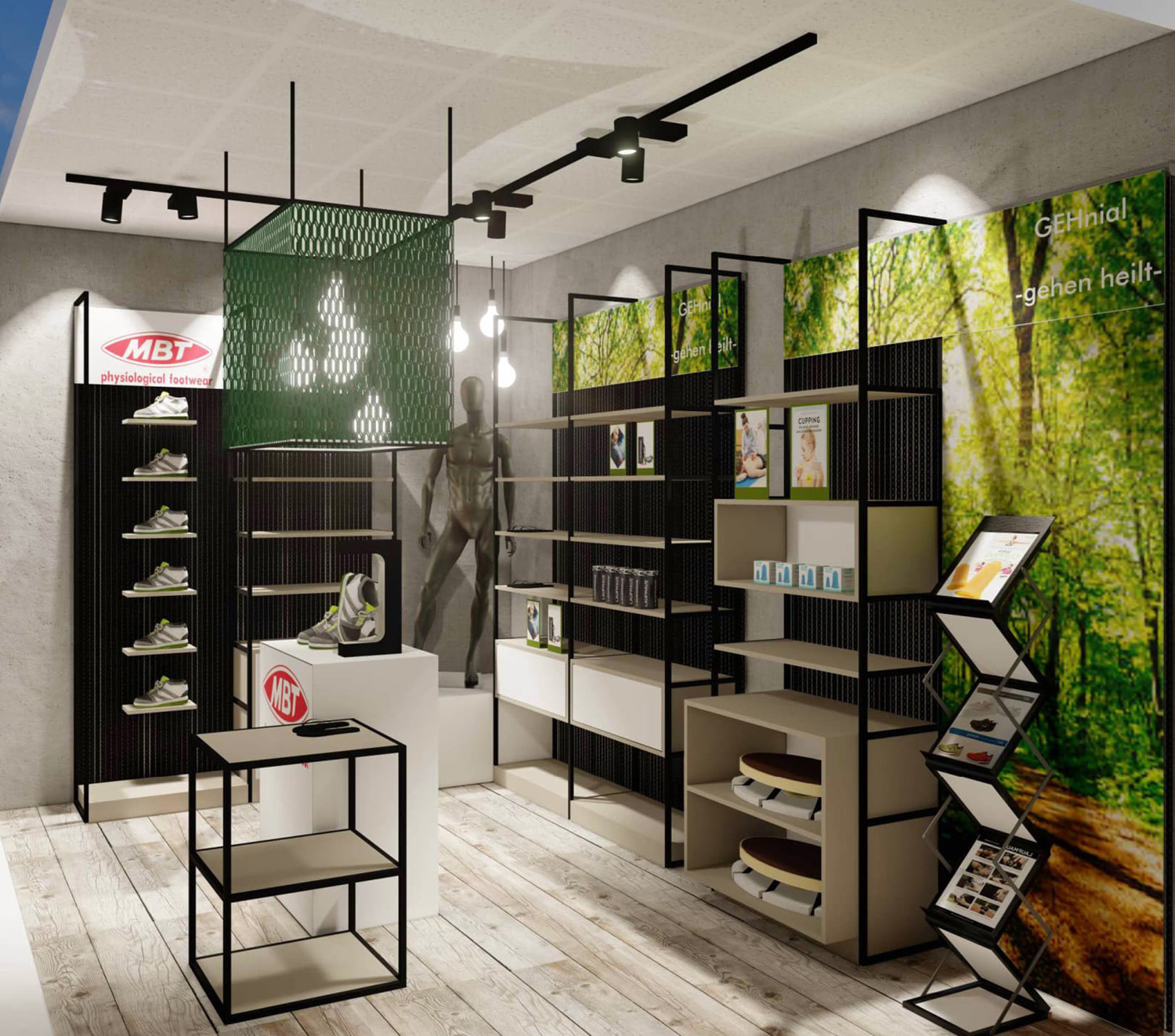 Besonderes Augenmerk lag auf der hervorgehobenen Darstellung der MBT-Schuhe, die in einem eigenständigen Designbereich inszeniert wurden. Die Gestaltung orientierte sich an den ergonomischen und gesundheitlichen Ansprüchen der Produkte und schafft ein bewusstes Einkaufserlebnis für gesundheitsbewusste Kundinnen und Kunden.